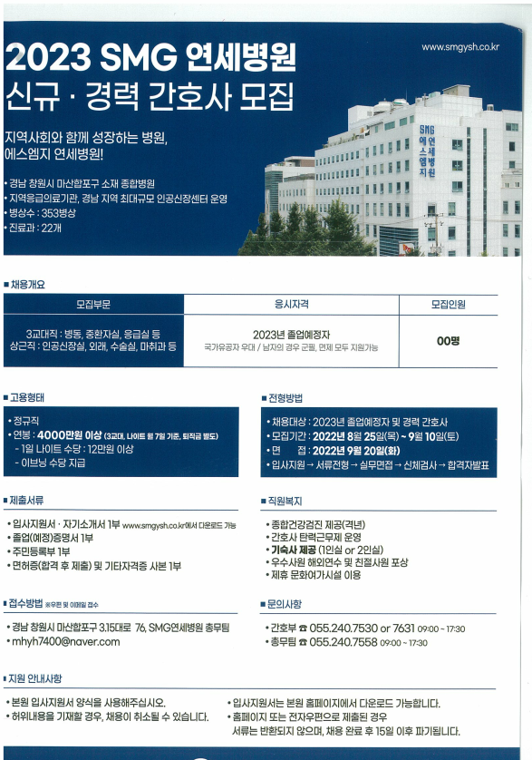 [에스엠지 연세병원] 2023년도 신규.경력 간호사 모집